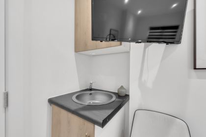 Welcome to your perfect urban retreat! It provides a smart and comfortable base for your city escapades. Enjoy the best of both worlds – the excitement of the city and the tranquility of your own private space. The main living space is cleverly organized to provide you with everything you need. The cozy double bed invites you to unwind after a day of exploration or business meetings. Need to catch up on work? No problem! A dedicated workspace is set up for your productivity.