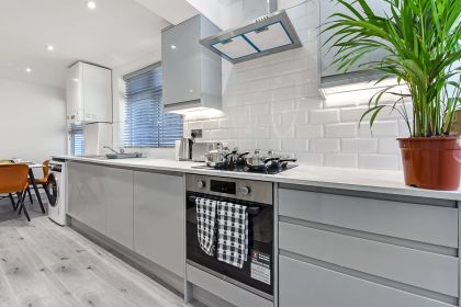 The 2BR flat in Streatham is designed to provide a warm and welcoming atmosphere that feels like home. The living room is spacious and bright, with large windows that let in plenty of natural light. The furniture is stylish and comfortable, featuring a large sofa, and a coffee table. You can relax in front of the TV or use the space for family activities like board games or puzzles. When it's time to cook, you'll be pleased with the modern and fully-equipped kitchen.